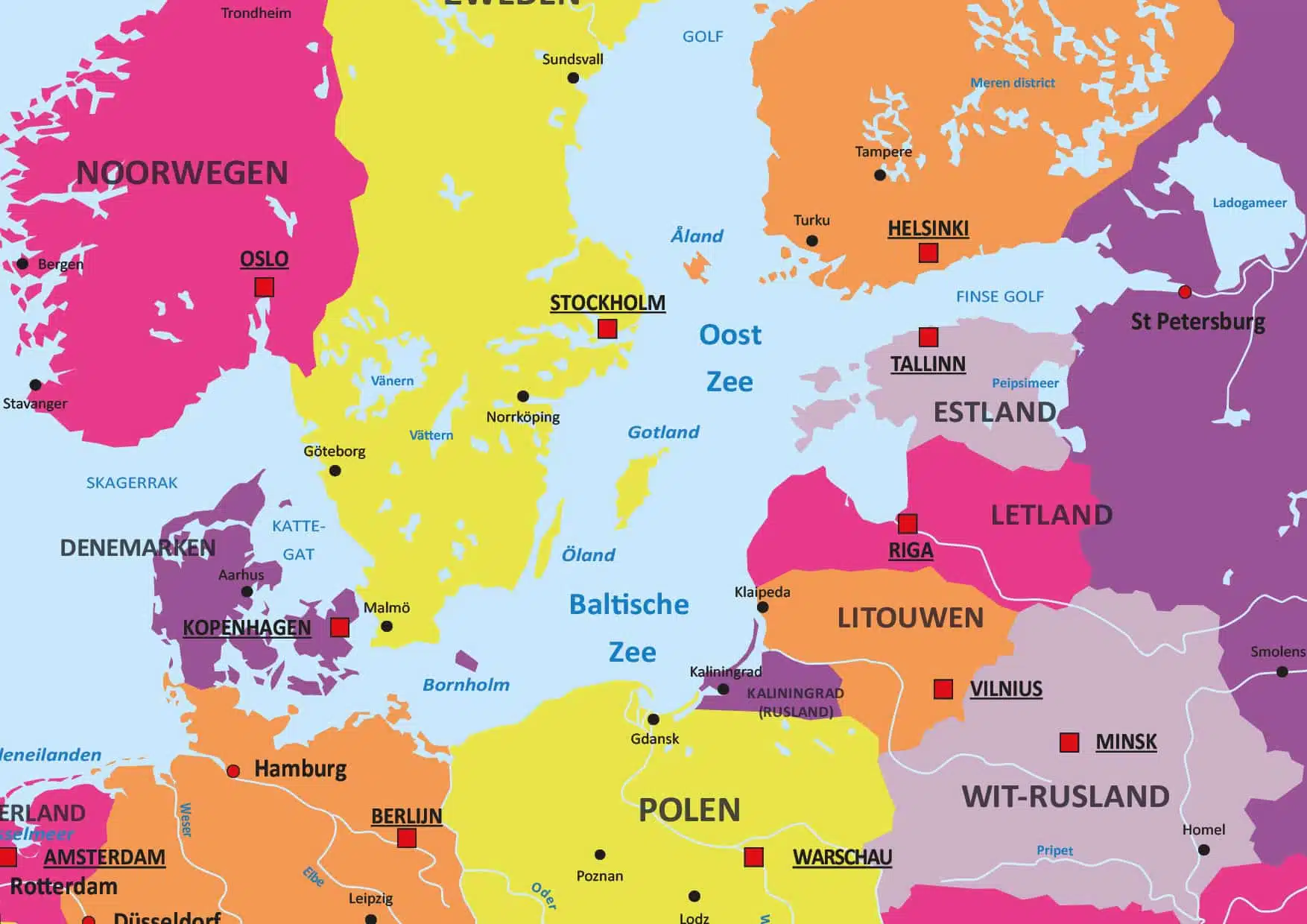 - Hoofdsteden en Grote Steden: Naast de hoofdsteden worden enkele van de grootste steden van elk land weergegeven, wat een dieper begrip van de stedelijke ontwikkeling in Europa mogelijk maakt.