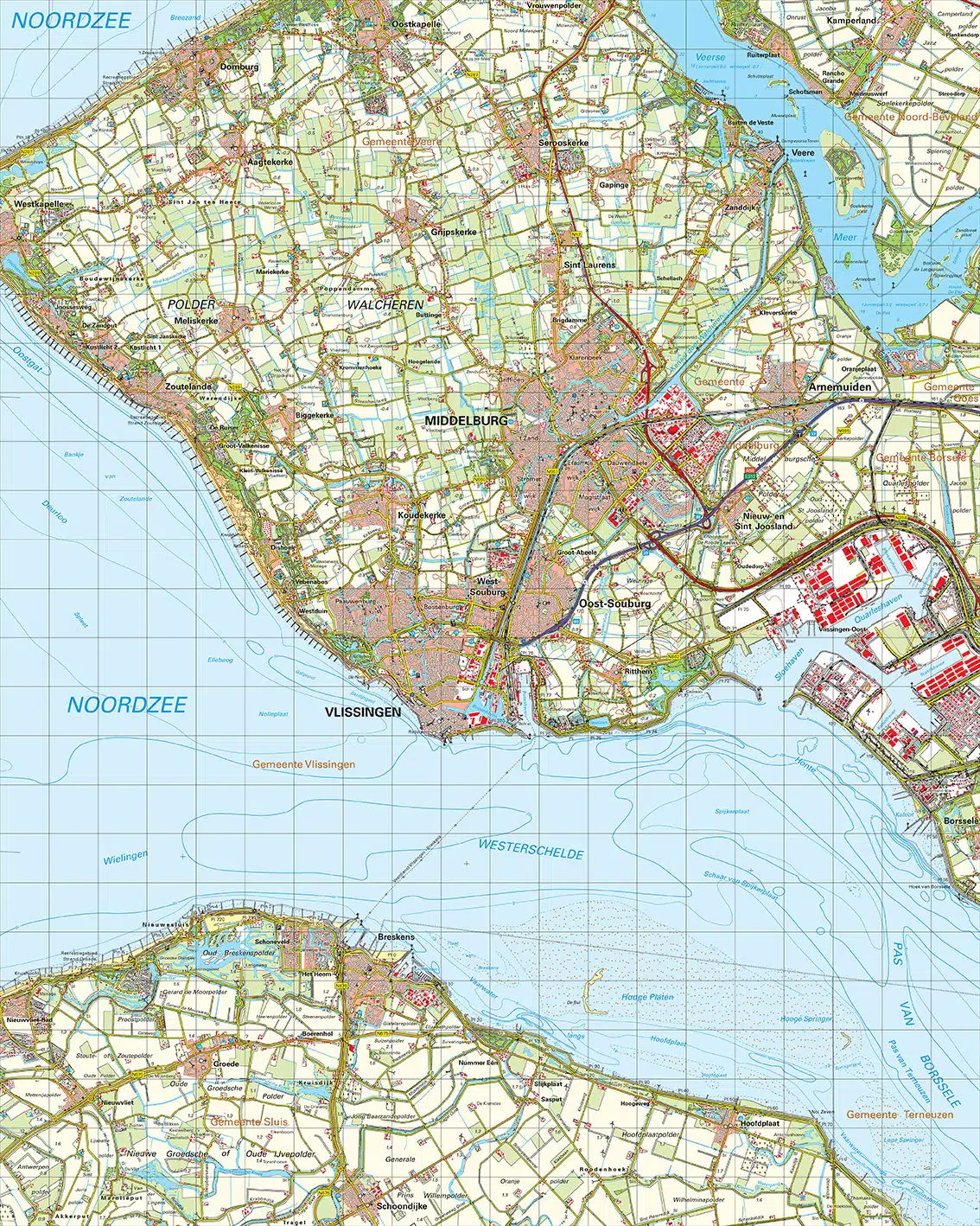 Deze topografische kaart 48W geeft een zeer gedetailleerd beeld van de omgeving Vlissingen en Middelburg. Het kaartbeeld is afgebeeld in de schaal 1:50.000 en is zeer geschikt voor het aflezen van informatie omtrent wegen, plaatsen, wateren, bossen en natuurgebieden. Het bestand wordt geleverd als JPG bestand dat is opgemaakt in een CMYK kleuren profiel.