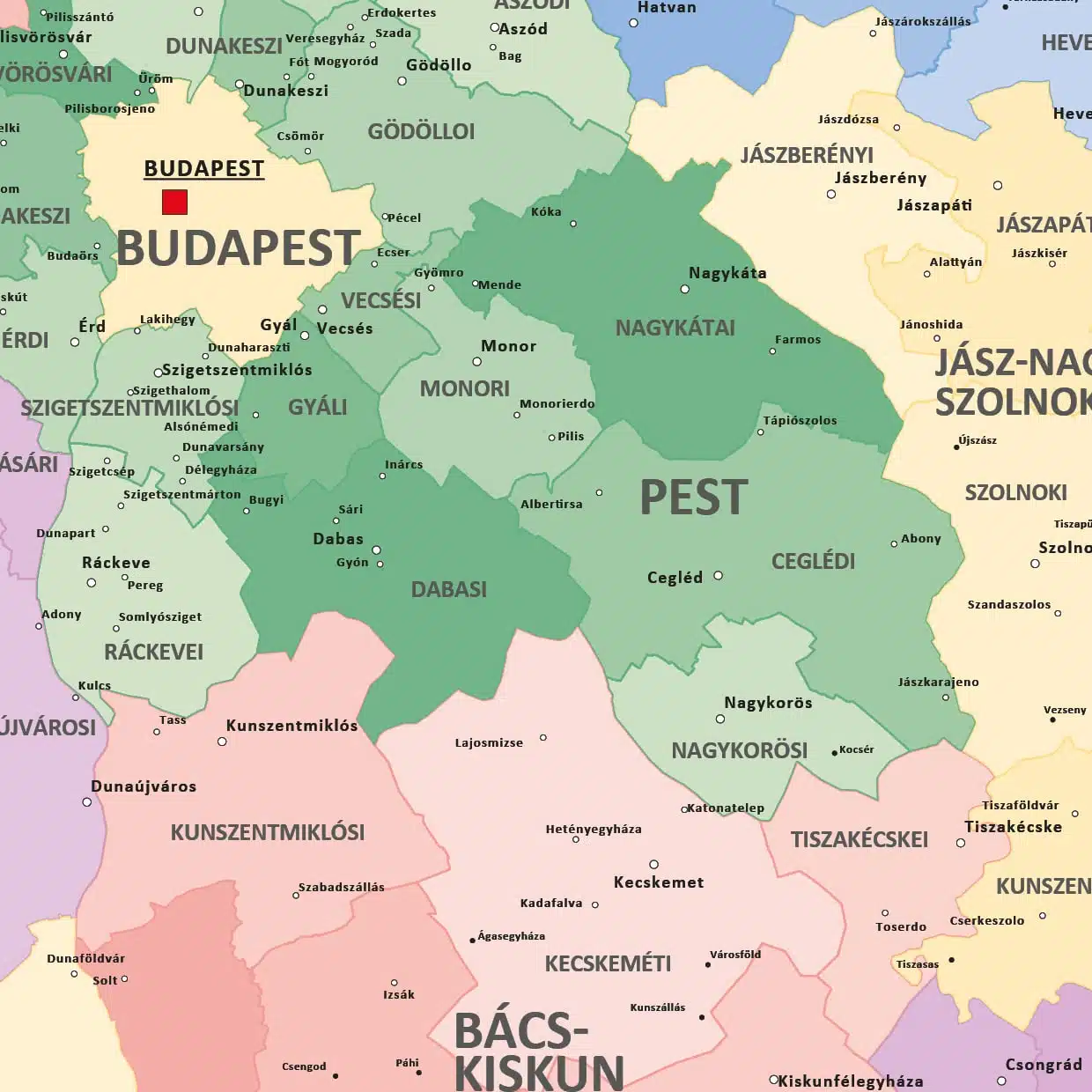 Deze staatkundige landkaart van Hongarije geeft zowel een mooi beeld van administratieve verdelingen als van alle plaatsen binnen Hongarije. Om het kaartbeeld te verduidelijken hebben wij de indeling van het land aangegeven met verschillende kleuren en kleur tinten. Dit maakt het kaartbeeld makkelijk leesbaar.