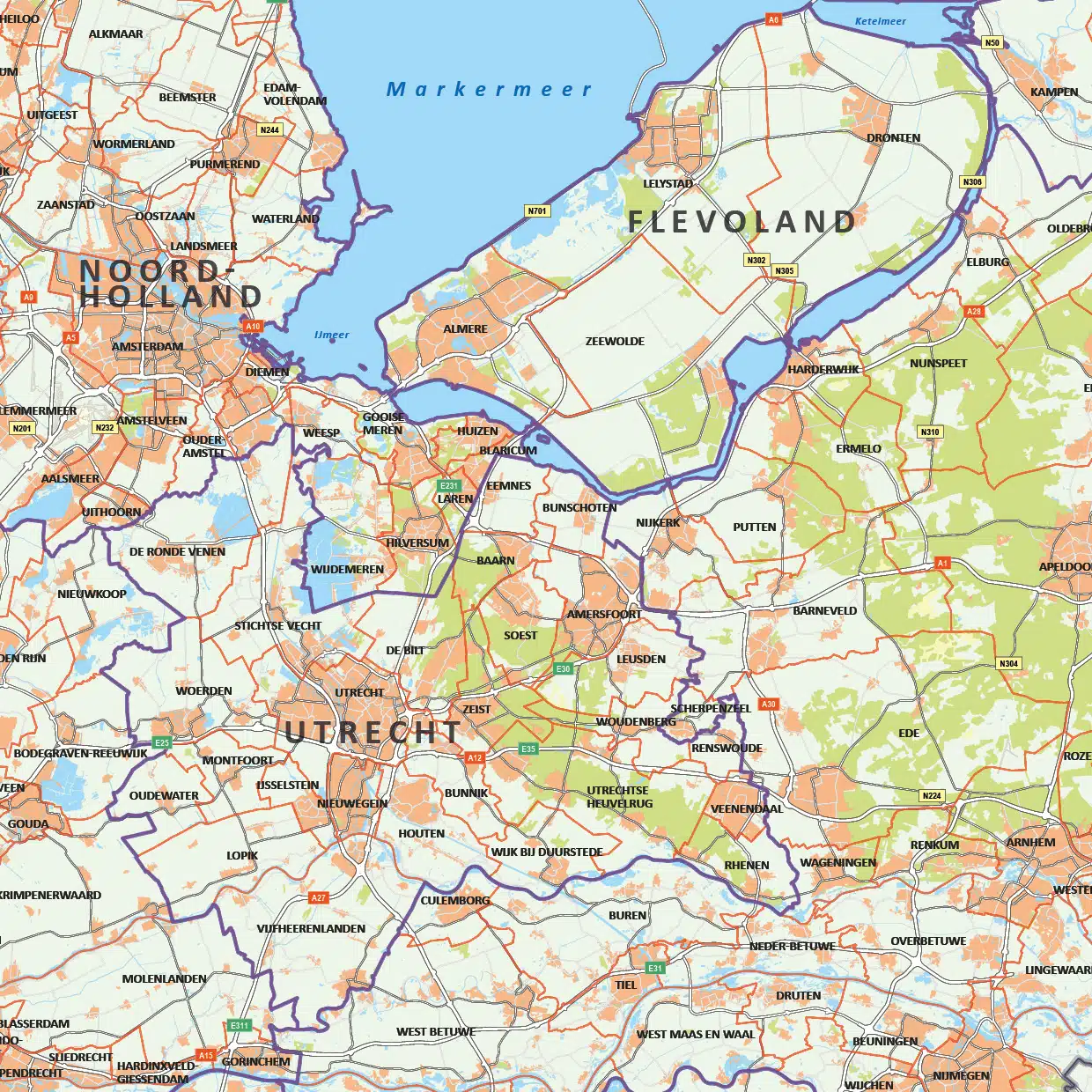 Als extra toevoeging is het kaartbeeld voorzien van bebouwde gebieden, zandgronden, wateren, bossen, provincie grenzen, wegen, wegennummers, schaalbalk en natuurlijk een duidelijke legenda.