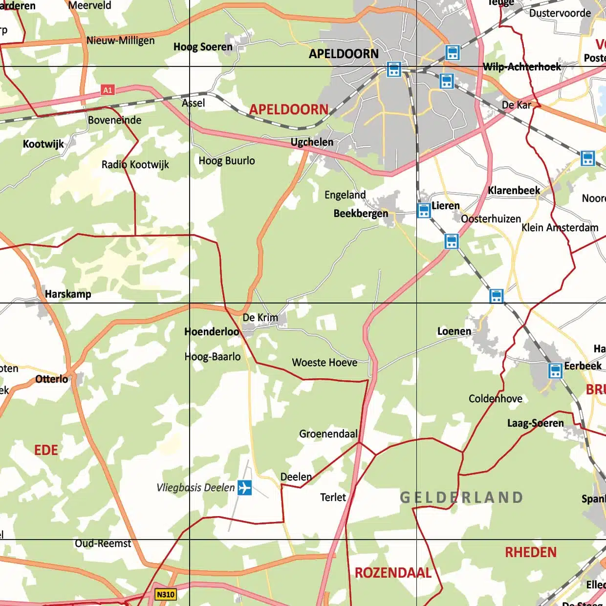 Deze gemeentekaart van de provincie Gelderland is duidelijk en gedetailleerd opgezet in mooie heldere kleuren. De kaart geeft niet alleen de steden en dorpen weer, maar bijvoorbeeld ook de wegen, de groengebieden, wateren en spoorlijnen. Deze worden weergegeven in de vorm van verschillende kaartsymbolen, welke worden uitgelegd in een handige legenda met schaalbalk. Door middel van de grid index oftewel rasterindex op de kaart zijn verschillende plaatsen binnen de provincie makkelijk vindbaar.
