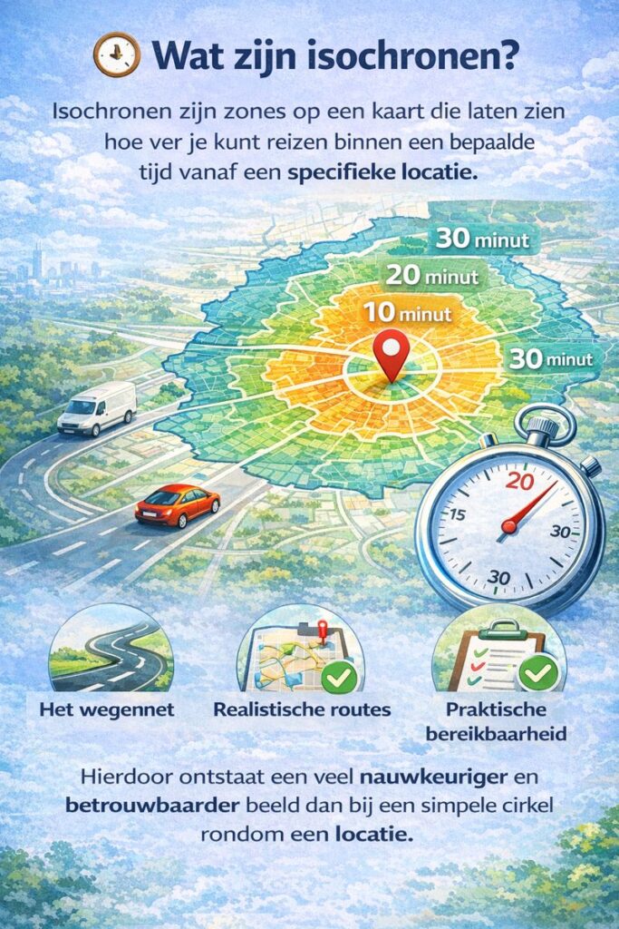 Isochronen zijn zones op een kaart die laten zien hoe ver je kunt reizen binnen een bepaalde tijd vanaf een specifieke locatie.
